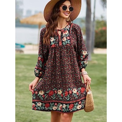 Womens Casual V Neck 3/4 Sleeve Boho Floral Printed Loose Short Mini Summer Beach Dress